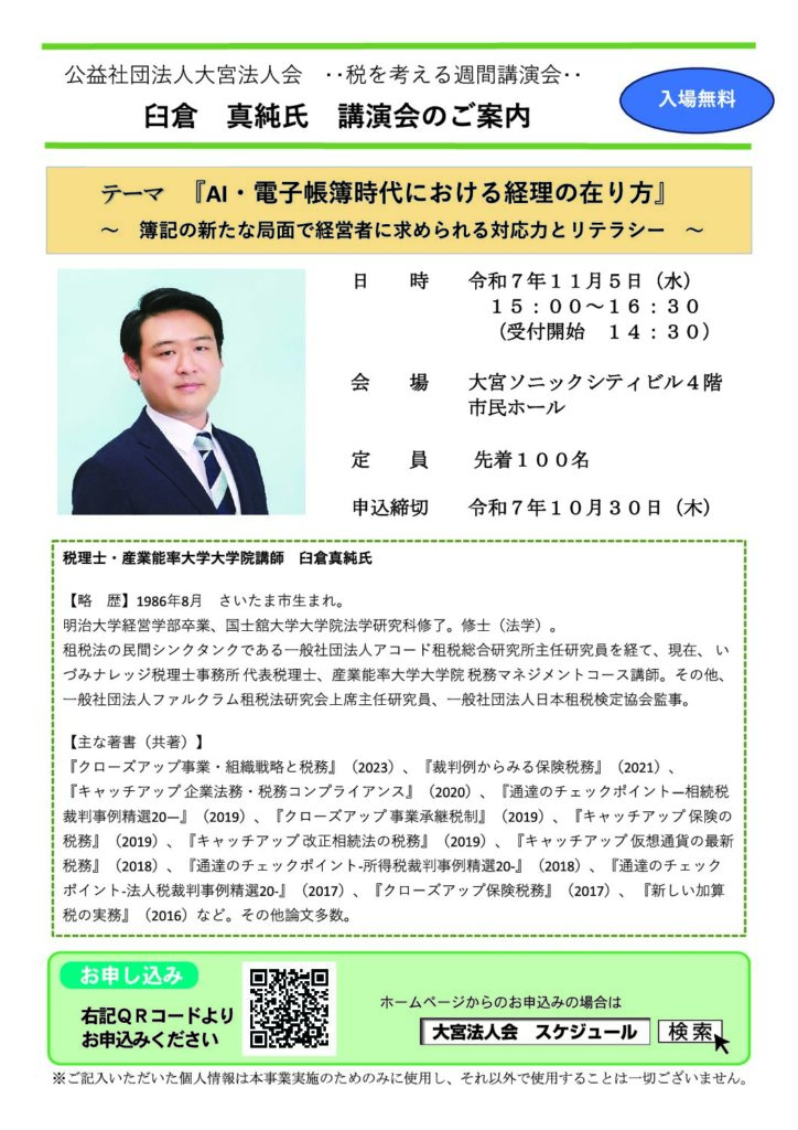 Home > 11月5日(水) 「税を考える週間」公開講演会 開催のお知らせ 【開催日】令和7年11月5日(水) 15:00~16:30(大宮法人会会員・会員以外も参加可能)【会 場】大宮ソニックシティビル4F 市民ホール【テーマ】「『AI・電子帳簿時代における経理の在り方』 ~簿記の新たな局面で経営者に求められる対応力とリテラシー~」【講 師】臼倉 真純氏 税理士・産業能率大学大学院講師 【参加費】無料・ご案内チラシ・ お申込みはこちら から おしらせ セミナー情報を更新しました
